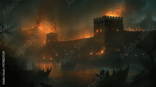 fire, fortress, wall, night, smoke, boat, water, destruction, battle, chaos, ruin, landscape, shadow, glow, mediaeval, architecture, history, war, flames, danger, gloom, eerie, atmosphere, siege, conflict, survival, darkness, lighting, silhouette, scene, environment, nature, strategy, mystery, tension, adventure, peril, journey, escape, story, imagination, artistry, fantasy, creativity, vision, beauty, drama, emotion