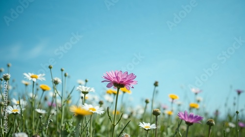 A Burst of Color: A field of vibrant wildflowers dances in the sunlight, a tapestry of pink, yellow, and white against a backdrop of bright blue sky. The gentle breeze rustles the petals.