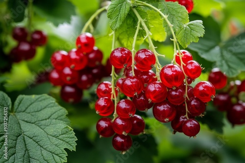 bush, redcurrant, laden, ripe, bright, red, berry, glossy, fruit, hanging, cluster, against, vibrant, green, leaf