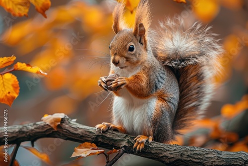 A bushy-tailed squirrel holding an acorn, sitting on a tree branch. The background shows autumn leaves in vibrant colors