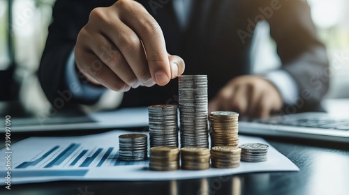 A business accountant or banker possibly a businessman is calculating and analyzing stock financial indices while wisely and carefully stacking coins symbolizing financial growth