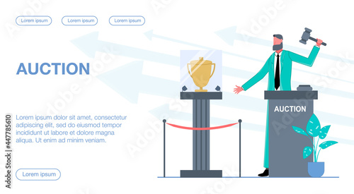 A businessman conducts an auction, and there is a trophy on a pedestal nearby flat vector illustration
