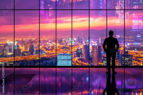 A businessman gazes at the cityscape and a digital display from behind. The artwork, a mix of media, depicts him positioned in front of a big screen hologram with business information.