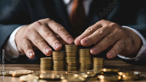 A businessman holding stacked money coins, symbolizing financial savings, security, and investment growth concept
