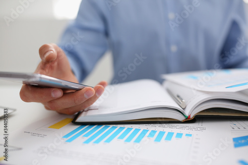 A businessman holds a new smartphone in his hand The mobile application market shows a display you can insert your image for advertising or financial statistics.