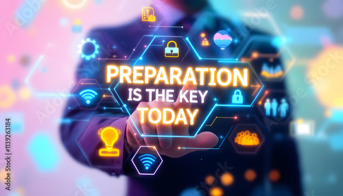 A Businessman interacting with glowing hexagonal icons and the bold text "PREPARATION IS THE KEY TODAY," symbolizing strategy and innovation.