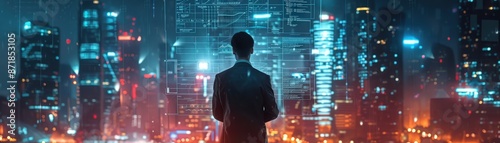 businessman, digital, interface, futuristic, city landscape, night, neon, light, technology, datum, analysis, modern, urban, skyline, innovation, hologram, business, professional, city, tech, future, illuminated, high technology, metropolis, corporate, cyber, smart, visualisation, information, network, urbanisation, progress, development, advanced, connectivity, virtual, screen, display, science fiction, nightscape