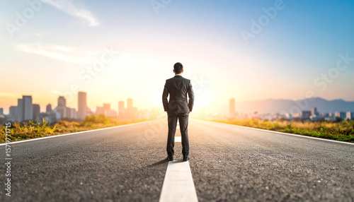 A businessman stands on an empty road, gazing at a city skyline and a bright horizon, symbolizing ambition and new opportunities