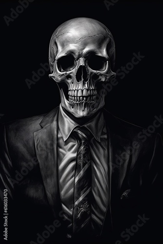 A businessman with a bare skull, instead of a head, dressed in a business suit on a dark background. Vertical Generative AI illustration.