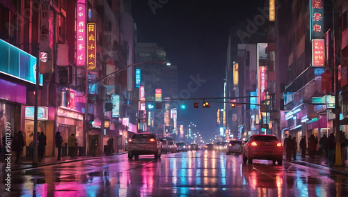 A bustling city street at night with bright neon signs, busy pedestrians, and vibrant lights reflecting off wet pavement. Ideal for capturing urban nightlife, modern city life, and dynamic street