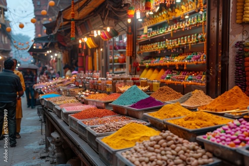 A bustling market scene with stalls selling Diwali decorations, sweets, and colorful rangoli powders, capturing the festive spirit.