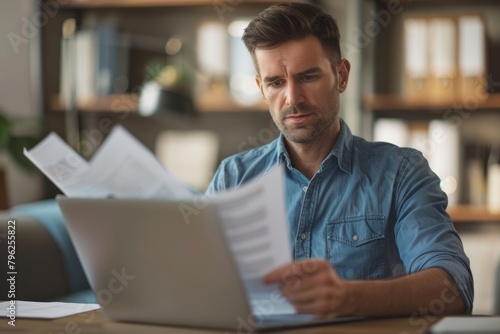A busy young professional businessman checks documents on his laptop in his office. Serious business accounting experts in the workplace read legal documents overview of company documents.