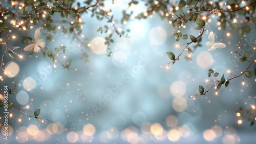 A butterfly is flying above a tree with a blue sky background. The butterfly is surrounded by a blurry background, giving the impression of a dreamy, ethereal atmosphere