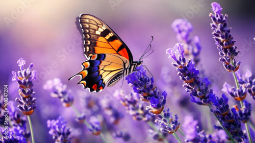 A butterfly on a lavender field, wings contrasting beautifully against the purple flowers