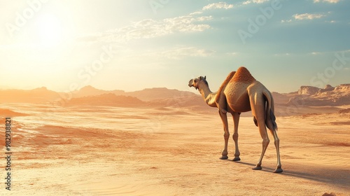 A camel walks through the desert on a bright, sunny day.