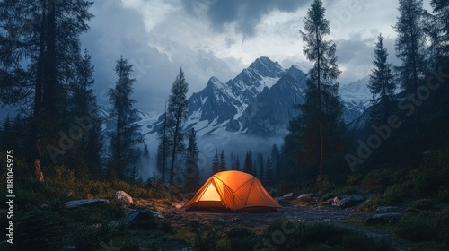 A campsite with a glowing orange tent surrounded by tall pines and snowy peaks at twilight