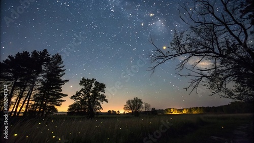 A canvas of inky blackness with stars shining brightly like scattered fireflies on a summer evening, glowing, celestial, night sky