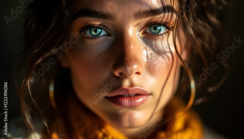 A captivating close-up of a young woman with striking blue eyes and freckled skin bathed in soft light