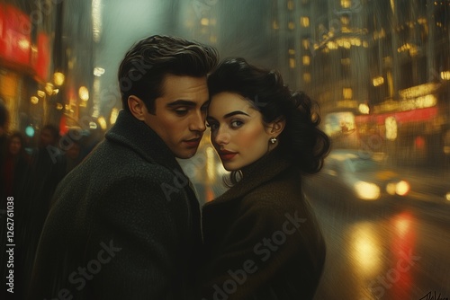 A captivating digital painting of a stylish couple in a bustling city at night, exuding vintage elegance and timeless romance.