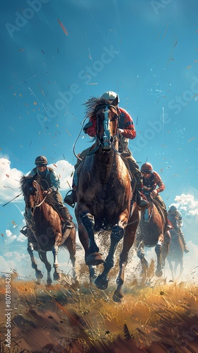 a captivating horse racing game wallpaper featuring riders on running horses against a backdrop of a clear blue sky. Game art design