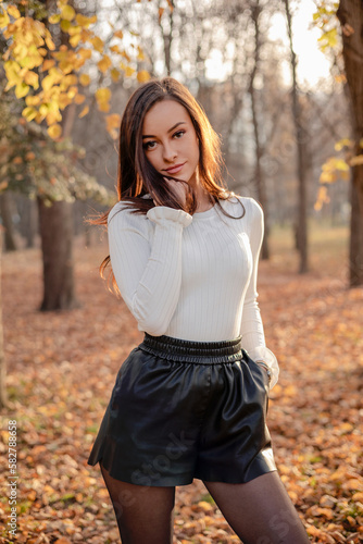 A captivating image featuring a beautiful brunette woman in the backdrop of a scenic fall park, radiating autumnal charm and natural beauty