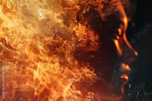 A captivating image of a fiery visage, blending face features with swirling flames, creating a mesmerizing, ethereal atmosphere.