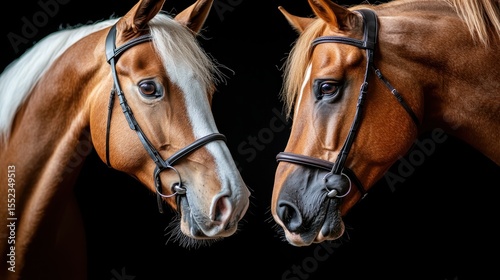 A captivating moment of two horses gazing at each other, showcasing their beauty and grace in a strikingly elegant and intimate manner against a dark backdrop.