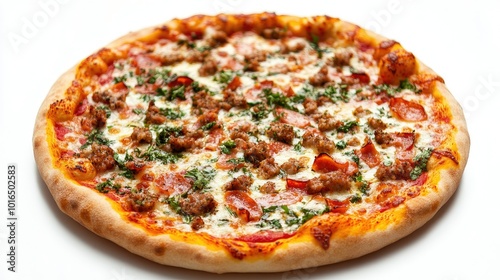 A captivating overhead shot of a whole pizza garnished with herbs and spices, with a clean background providing ideal copy space for menu items or marketing messages.