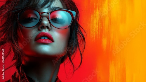 fashion, style, glamour, woman, portrait, beauty, confident, expressive, eye, lip, red, orange, eyewear, contemporary, fashionable, bold, striking, captivating, trendy, chic, edgy, cool, model, photoshoot, studio, light, illuminating, dramatic, artistic, photo, make-up, art, expression