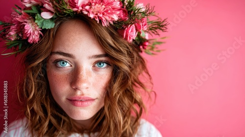 A captivating portrait of a young woman adorned with a vibrant floral crown, showcasing her striking blue eyes against a pink background, evoking beauty and nature.