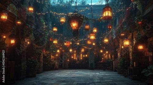A captivating scene of a courtyard filled with glowing lamps and colorful decorations, embodying festive spirit