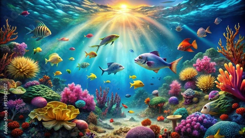 underwater, adventure, journey, eerie, creature, vibrant, colours, sea, ocean, exploration, surreal, fantasy, marine life, exotic, discovery, mysterious, deep sea, diving, scuba diving, aquatic, beauty, majestic, unique