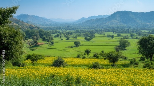 A captivating view of a countryside, blending yellow flowers and green fields with distant hills.