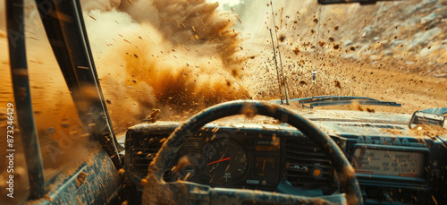 A car is driving through a sandy desert with a lot of dust