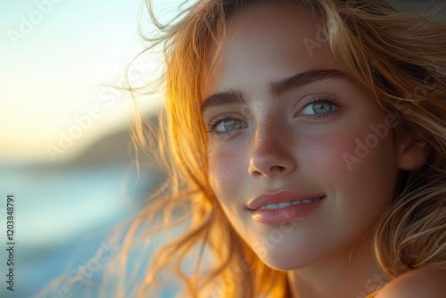 a carefree young woman with windswept hair radiating joy while leaning out of a vintage convertibles window golden hour sunlight creating a dreamy atmosphere coastal highway backdrop