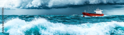 A cargo ship navigating through stormy seas amidst dark, swirling clouds.