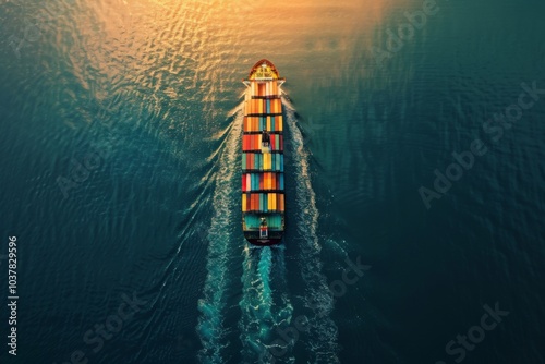 A cargo ship sailing on the water, viewed from above, import and export logistics cargo shipping transportation of goods by container ship on the open sea, cargo ship