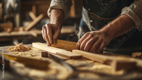 carpenter, measuring, cutting, wood, tied-up, workshop, sawdust, carpenter's shop, tool, scattered, around, carpenter's shop, scene, skilled, craftsmanship, style, photo, focusing, meticulous, work, technique, high, quality, image, highlighting, precision, environment
