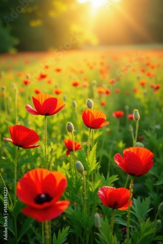 A carpet of red poppies blankets a lush green summer meadow, bathed in golden sunlight , texture, royalty free