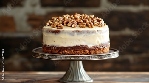 A carrot cake topped with caramelized walnuts, placed on a vintage cake stand against a rustic brick wall background