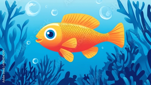 A cartoon fish with big eyes swims through blue water with seaweed.