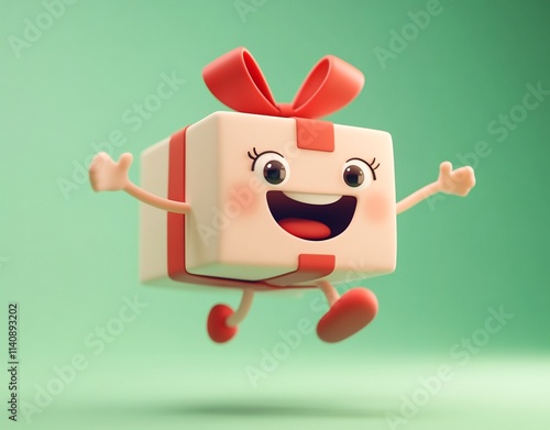A cartoon gift box with a smiling face and arms is jumping up in the air.