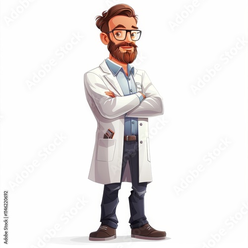 A cartoon illustration of a male doctor with beard and glasses standing with his arms crossed, wearing a white lab coat.