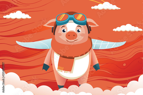 A cartoon pig, wearing a 1920s pilot's leather jacket, goggles, and cap, sits confidently in a vintage airplane cockpit. Aviator theme.