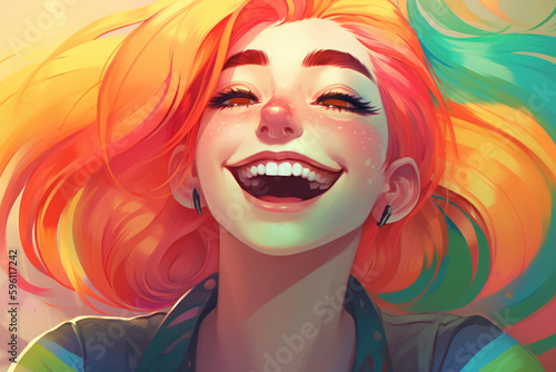 A cartoony human portrait of a young woman with bright, rainbow-colored hair and a wide, toothy grin.