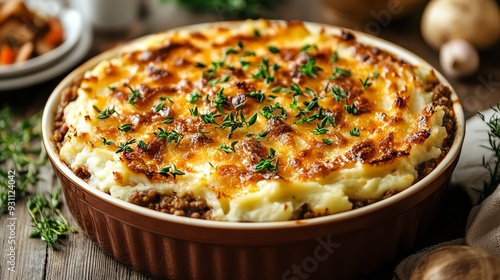 A casserole dish filled with bubbling shepherd s pie, topped with creamy mashed potatoes and browned to perfection, Homecooked shepherd s pie, comforting and savory