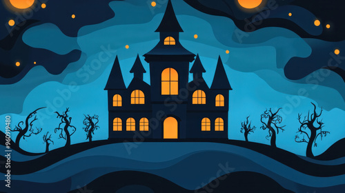 halloween, house, night, moon, illustration, vector, skittish, october, horror, dark, silhouette, background, design, castle, scarey, holiday, black, cartoon, tree, celebration, sky, creepy, bat, building, art, landscape, haunted, evil, hill, fear, decoration, card, poster, autumn, blue, pumpkin, ghost, gothic, light, banner, village, happy, old, flat, magic