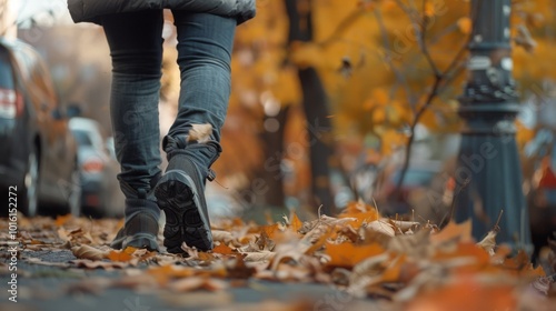 A casual stroll on a leaf-strewn urban sidewalk captures the essence of autumn’s vibrant colors and the tranquil pace of city life.