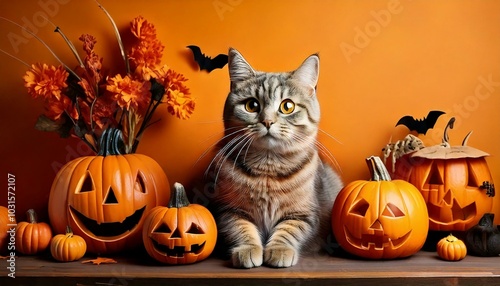cat, halloween, decoration, holiday, skittish, pet, lantern, pumpkin, animal, black, celebration, cute, fall, orange, autumn, felino, scarey, festive, jack, playful, costume, hat, kitten, october, sorcerer, face, decor, jack-o-lantern, background, atmosphere, bat, conceptual, cosy, dog, evil, fur, greeting, horror, image, interaction, look, magical, mammal, mood, party, postcard, seasonal, smile, theme