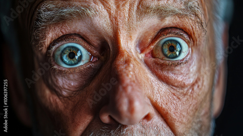 caucasian, grandfather, big, beautiful, eye, caught, moment, pure, surprise, face, full, character, age, showing, joy, wonder, detailed, close, up, portrait